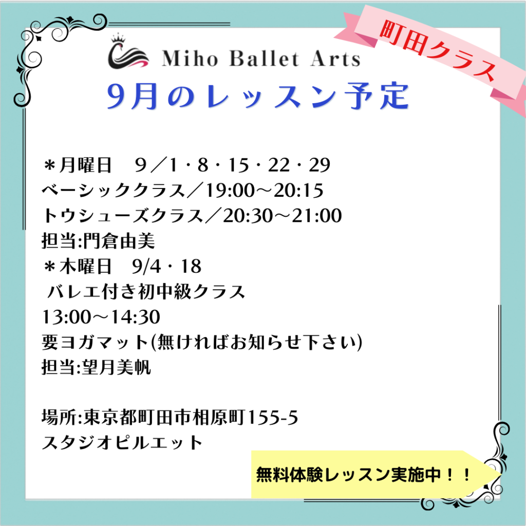 2025年9月・10月のレッスン予定のお知らせ【京王線沿い 町田・相模原市 / 下高井戸・世田谷区】大人の為のバレエ教室〜 Miho Ballet Arts(ミホバレエアーツ)