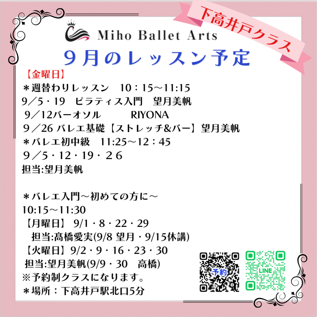 京王線沿い 町田・相模原市 / 下高井戸・世田谷区にある大人の為のバレエ教室「 Miho Ballet Arts(ミホバレエアーツ)」から2025年9・10月のレッスン予定のお知らせです。