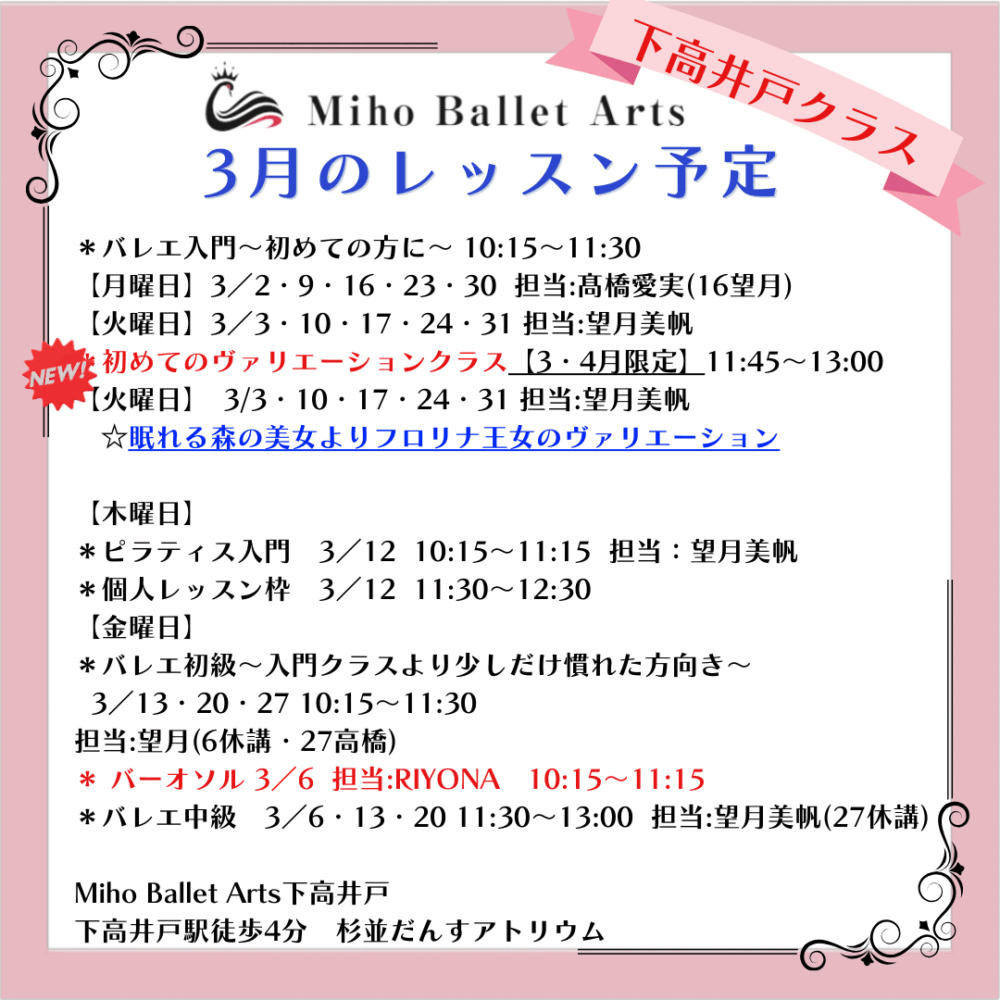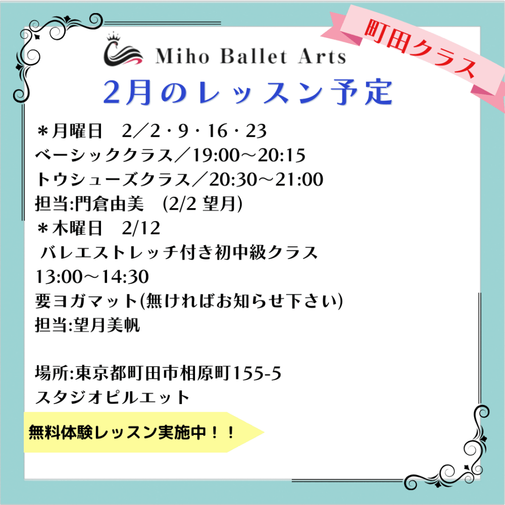 京王線沿い 町田・相模原市 / 下高井戸・世田谷区にある大人の為のバレエ教室「 Miho Ballet Arts(ミホバレエアーツ)」から2026年2月のレッスン予定のお知らせです。