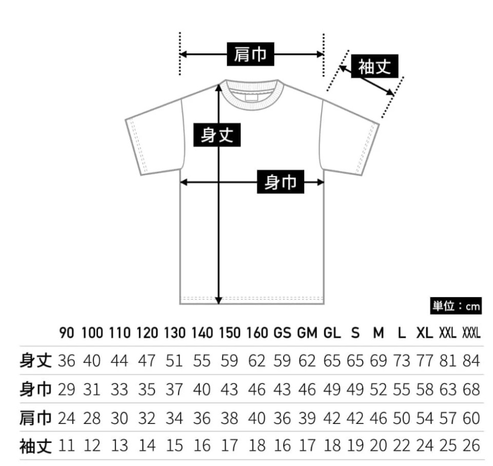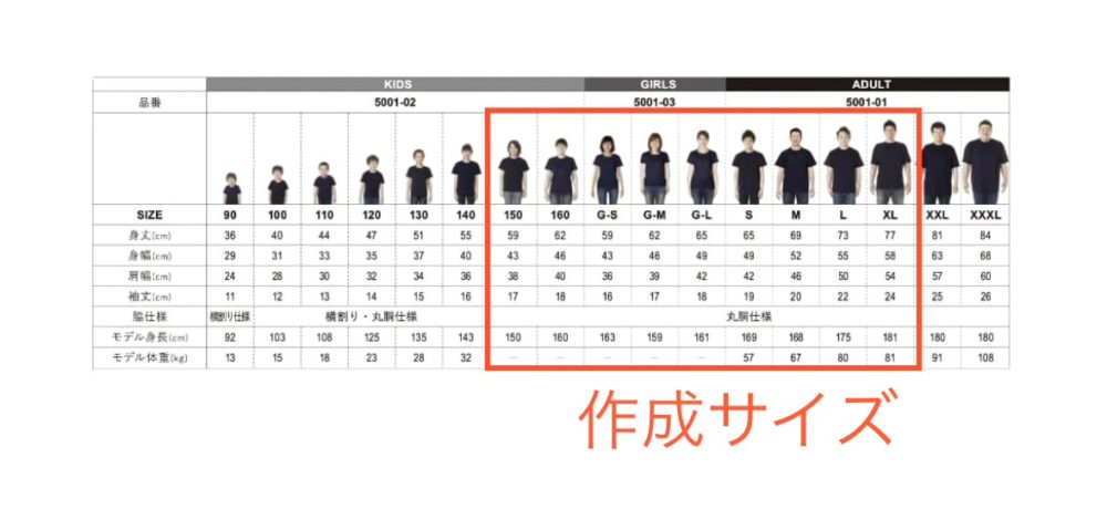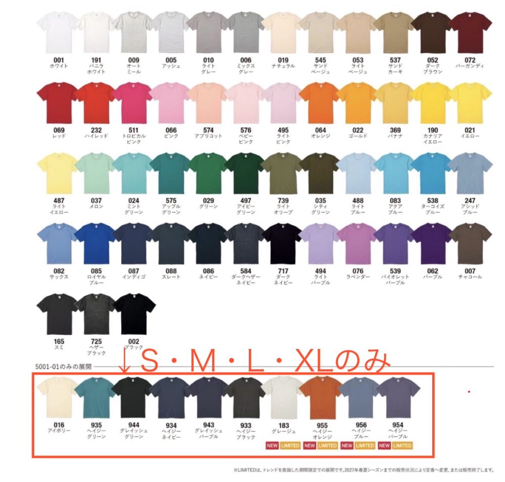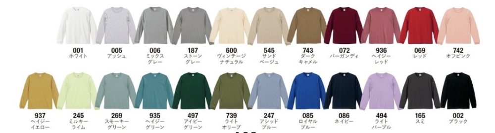 レディースTシャツ(GM・GL)はスタンダードのものより襟が少しゆったりしていて、腕まわりも少しゆったりしています。色展開はスタンダードのものと同じです。
