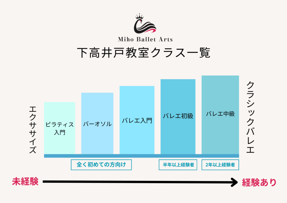 Miho Ballet Arts (ミホバレエアーツ) 下高井戸教室はバレエを中心に毎週月・火曜日「バレエ入門」、毎週金曜日週変わりで「ピラティス・バレエ初級・バーオソル」または「バレエ中級」からお好きなレッスンを受講いただけます。入会費だけ納めていただければ維持費・年会費などは一切かかりません。来たい時にチケットを購入いただくだけ、です。